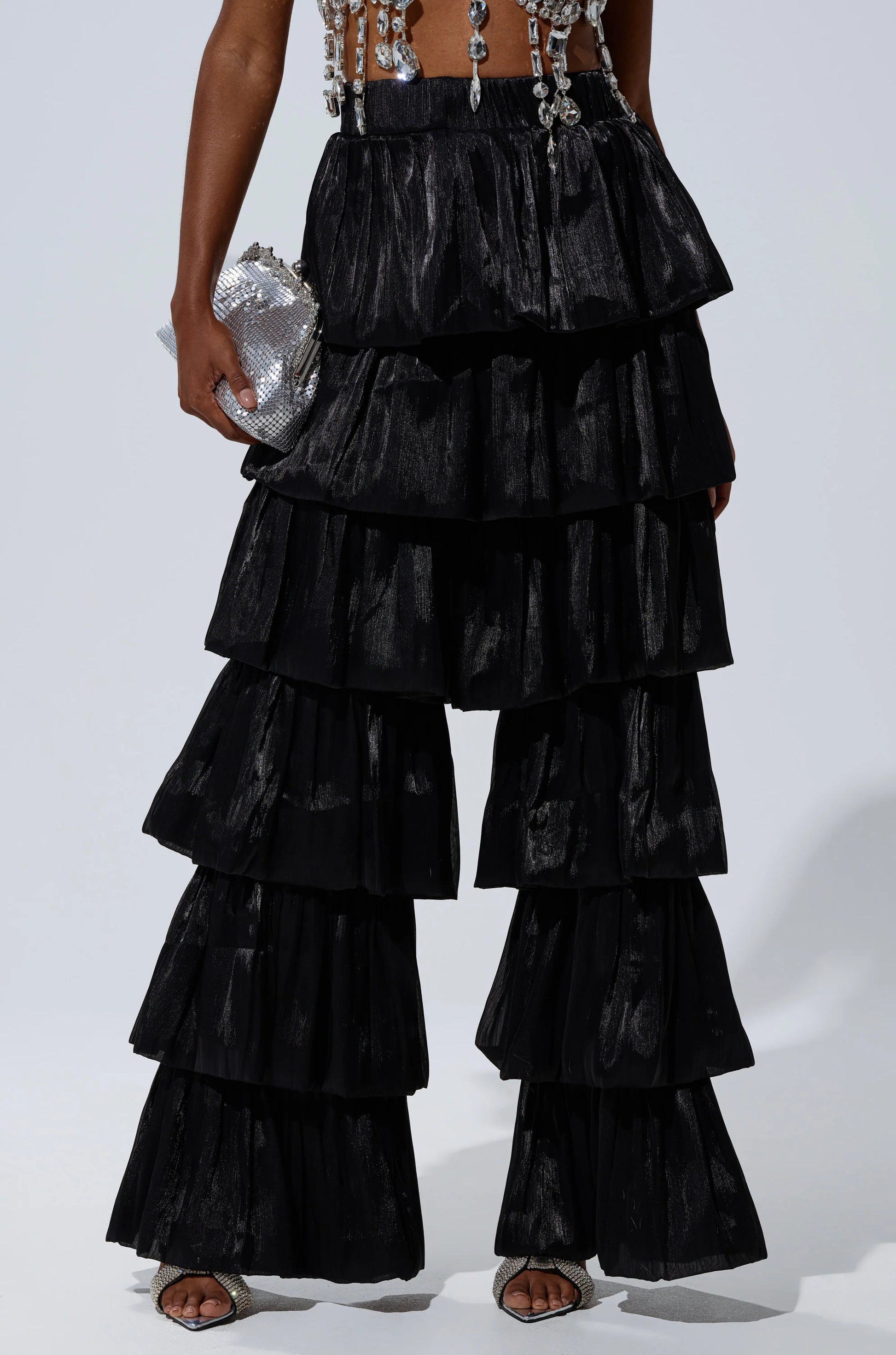 Crafted from a gauzy double-lined fabric with a subtle gleam, these flamboyant bottoms boast a tiered ruffle construction throughout, a high-rise fit, a shirred elastic waistband, a side zipper closure, and a wide-leg silhouette. Try pairing with a sparkly blouse, stiletto pumps, and a metallic clutch for all eyes on you.