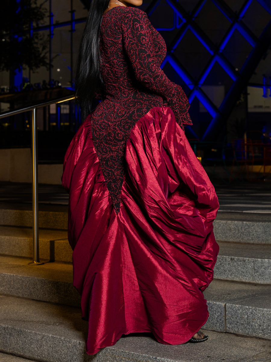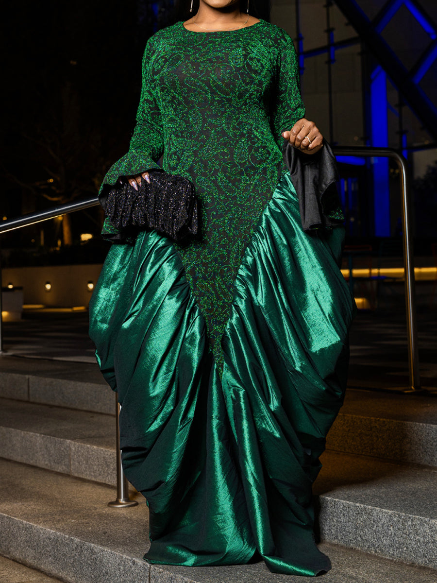 The fitted upper body hugs your curves comfortably, while the raw silk flows from the hips for an elegant, timeless look. Finished with long statement sleeves and a rich two-tone design, this dress is truly a showstopper.