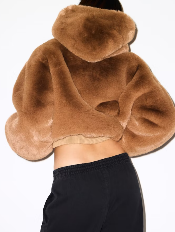 Make a soft, cozy statement. This faux fur zip-up jacket combines a smooth, satin lining with chic faux leather trim details. Front welt pockets keep you warm while ribbed details at the cuff and hem add an elevated finish. Fits true to size.