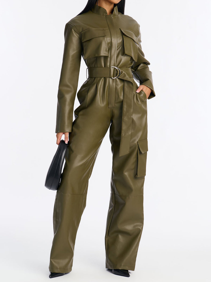 Faux Leather Cargo Straight Leg Jumpsuit