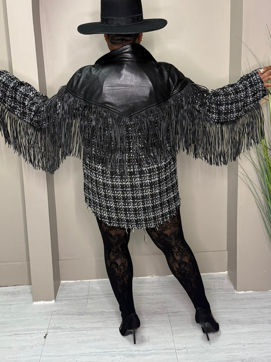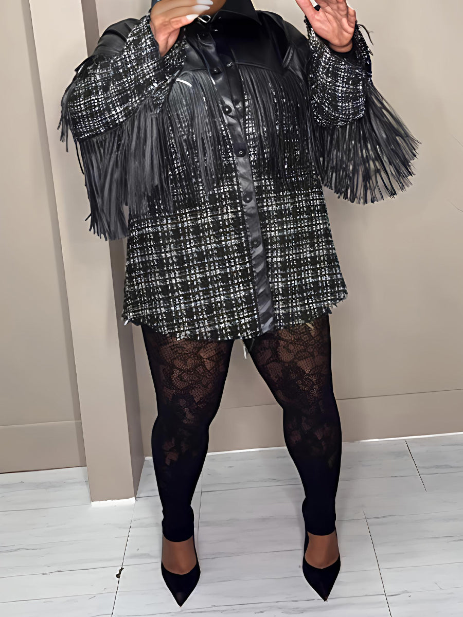 Faux Leather Trim Tweed Shacket(Free shipping)