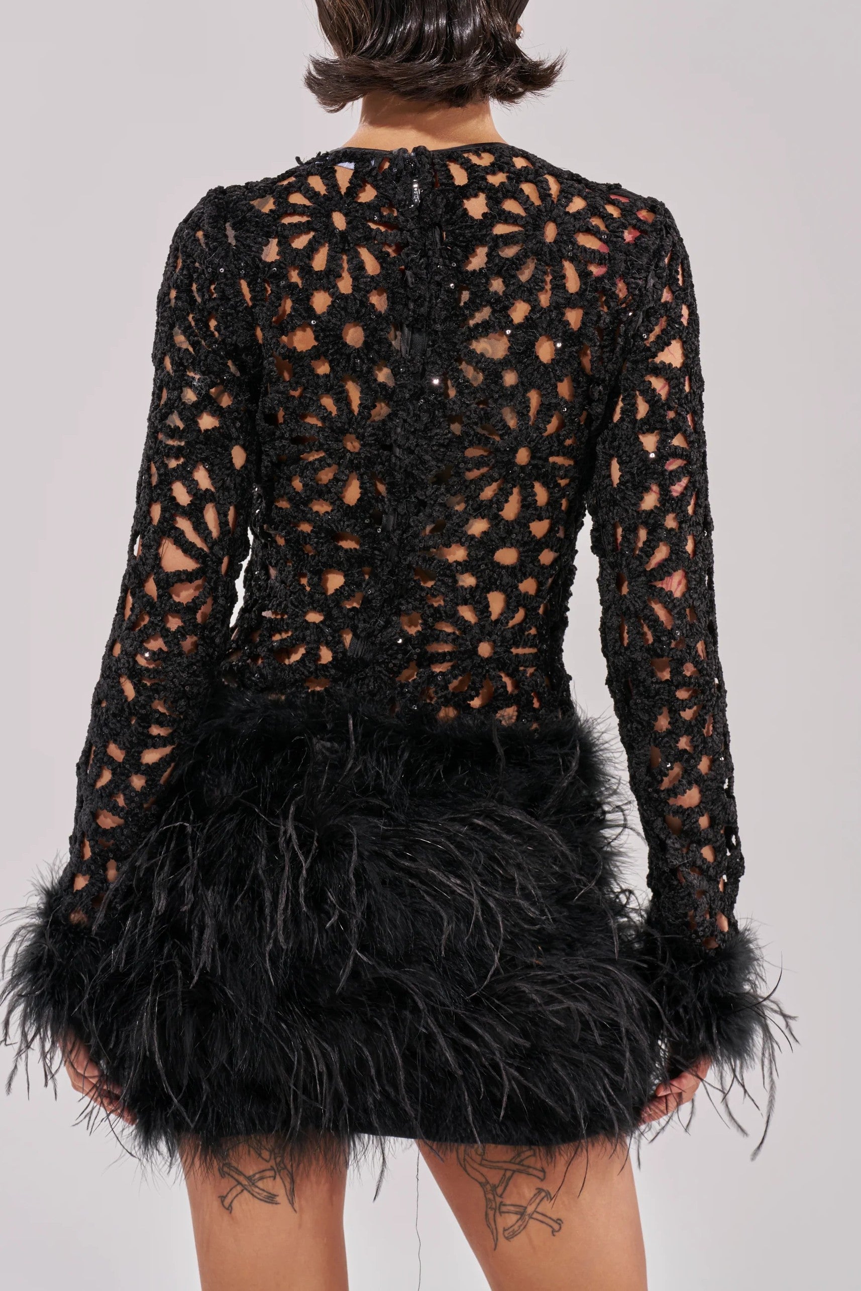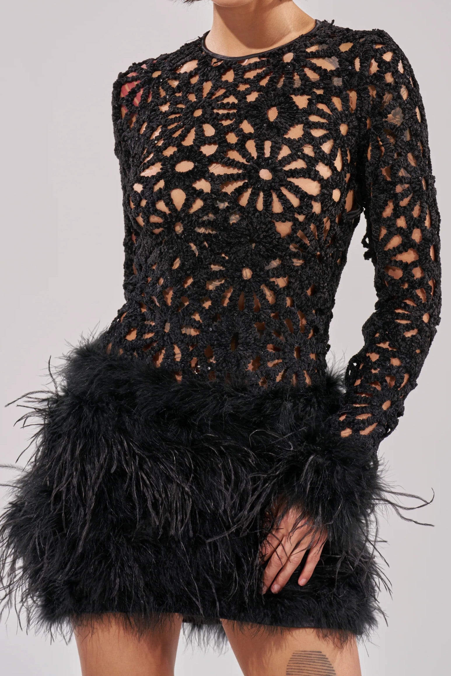 Knit Crochet Mini Dress With Feathers is a luxurious statement piece crafted from a cozy knit fabric with intricate cutout detailing and tonal sequin detailing interwoven throughout. It features a fitted bodice, voluminous tonal feather trim at the hem and cuffs, long sleeves, and a concealed back zipper closure. Complete with a curve-hugging, mini-length finish. Pair with strappy heels and minimal accessories for a show-stopping look. Perfect for cocktail parties, galas, and special events.