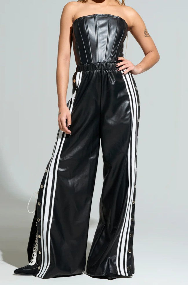 The  PU Jumpsuit is a chic, sporty one-piece crafted from soft, supple faux leather. It features a corset-inspired bodice with structural inner boning, a ruched, elasticized waistband, and wide pantlegs adorned with silver snap buttons and athletic stripes along the side seam. Complete with smooth inner lining and a metallic zip back closure. Style with stilettos and a cropped faux fur jacket for a party-perfect look.