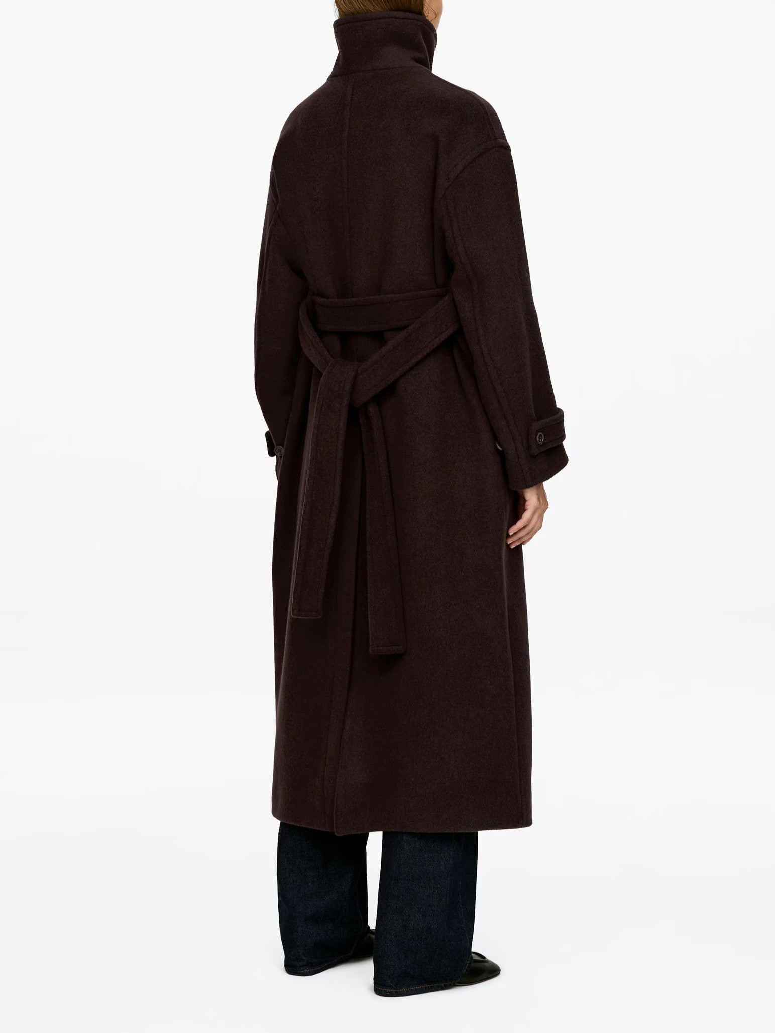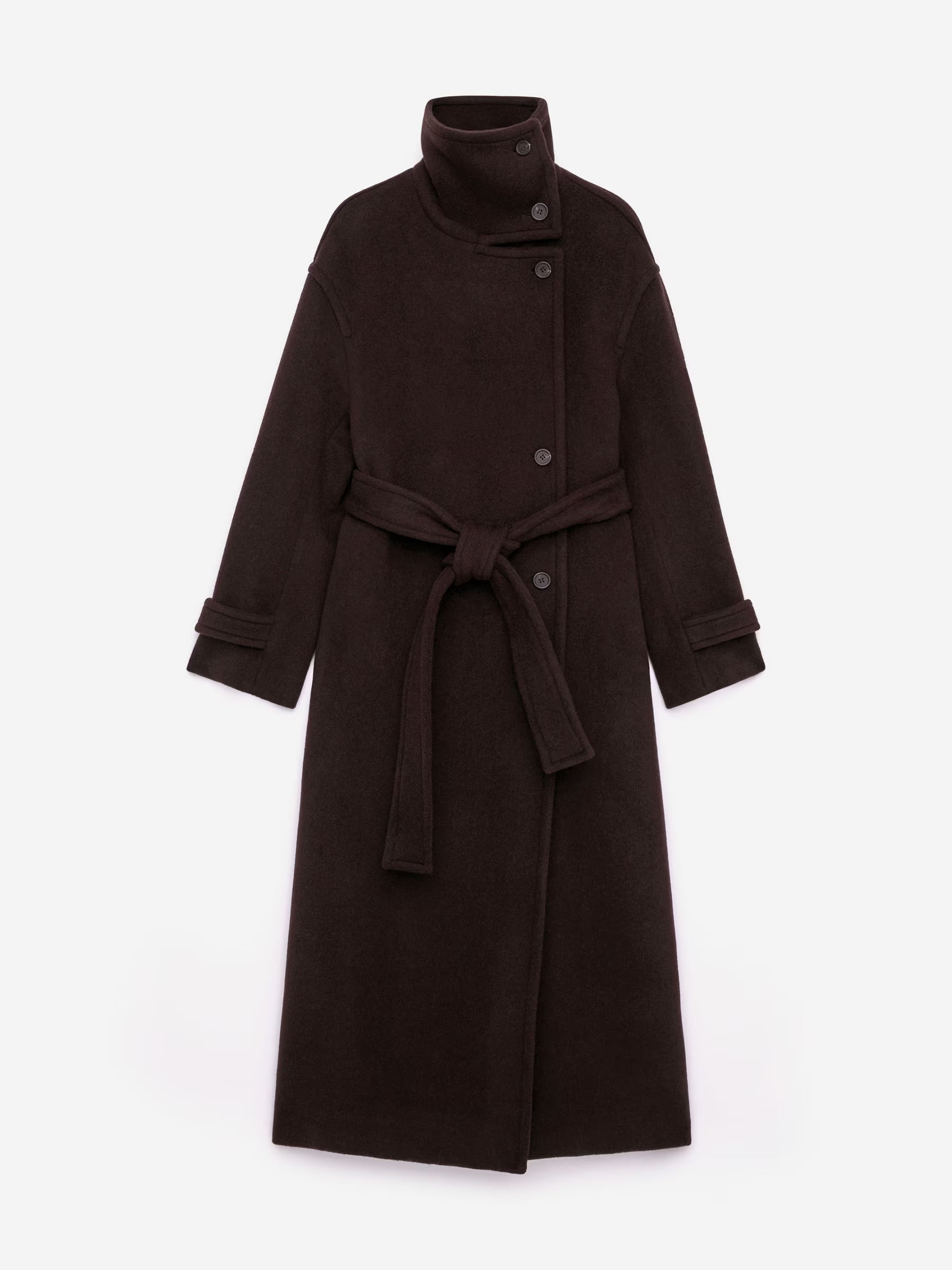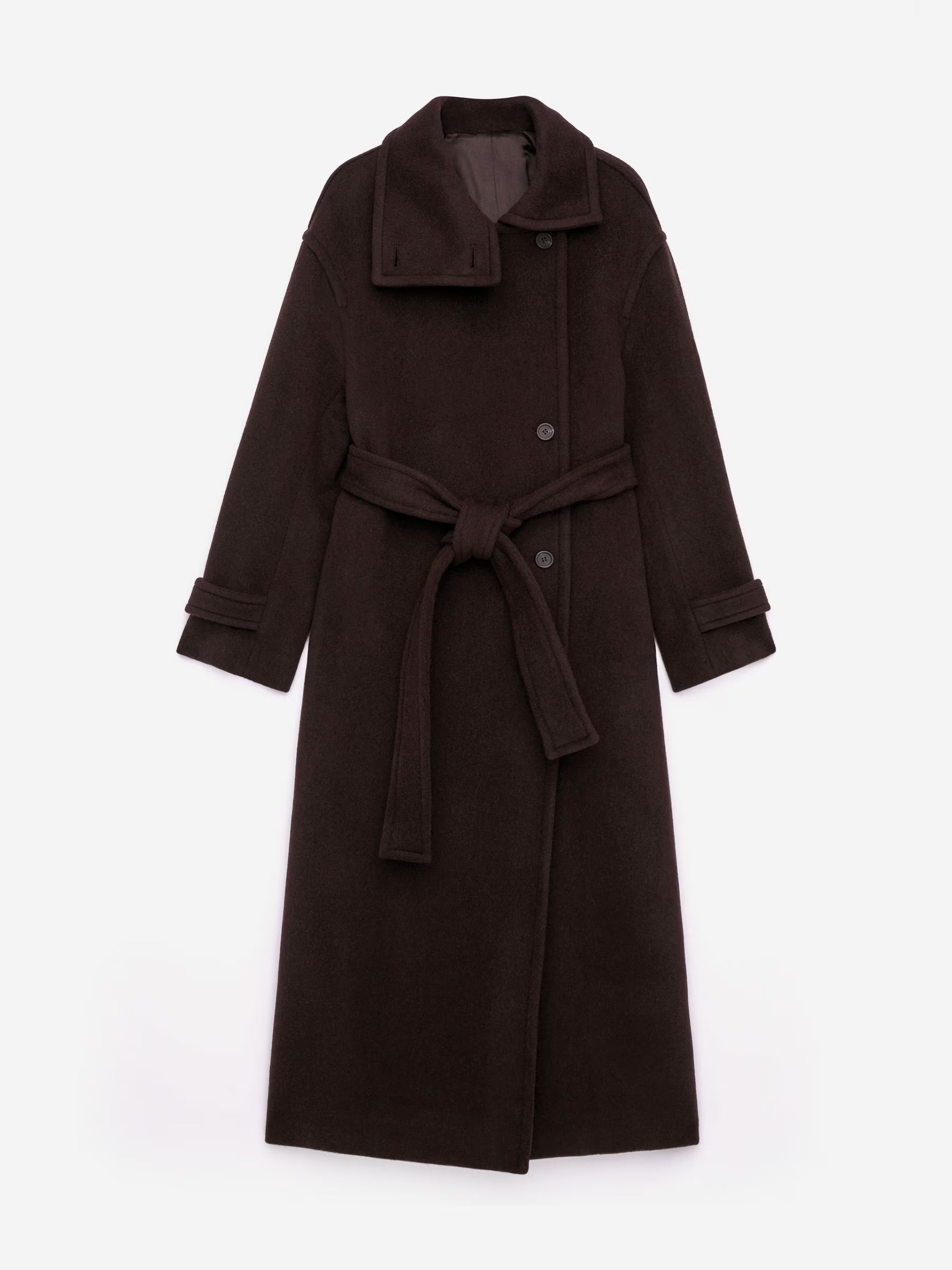 Belted maxi coat crafted from a wool blend. A fully lined, single-breasted style with a collar that can be worn folded down or standing. Pockets at side seams. Sleeve tabs with button closure. Oversized fit.