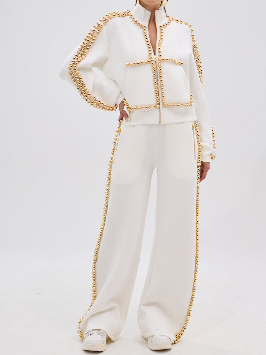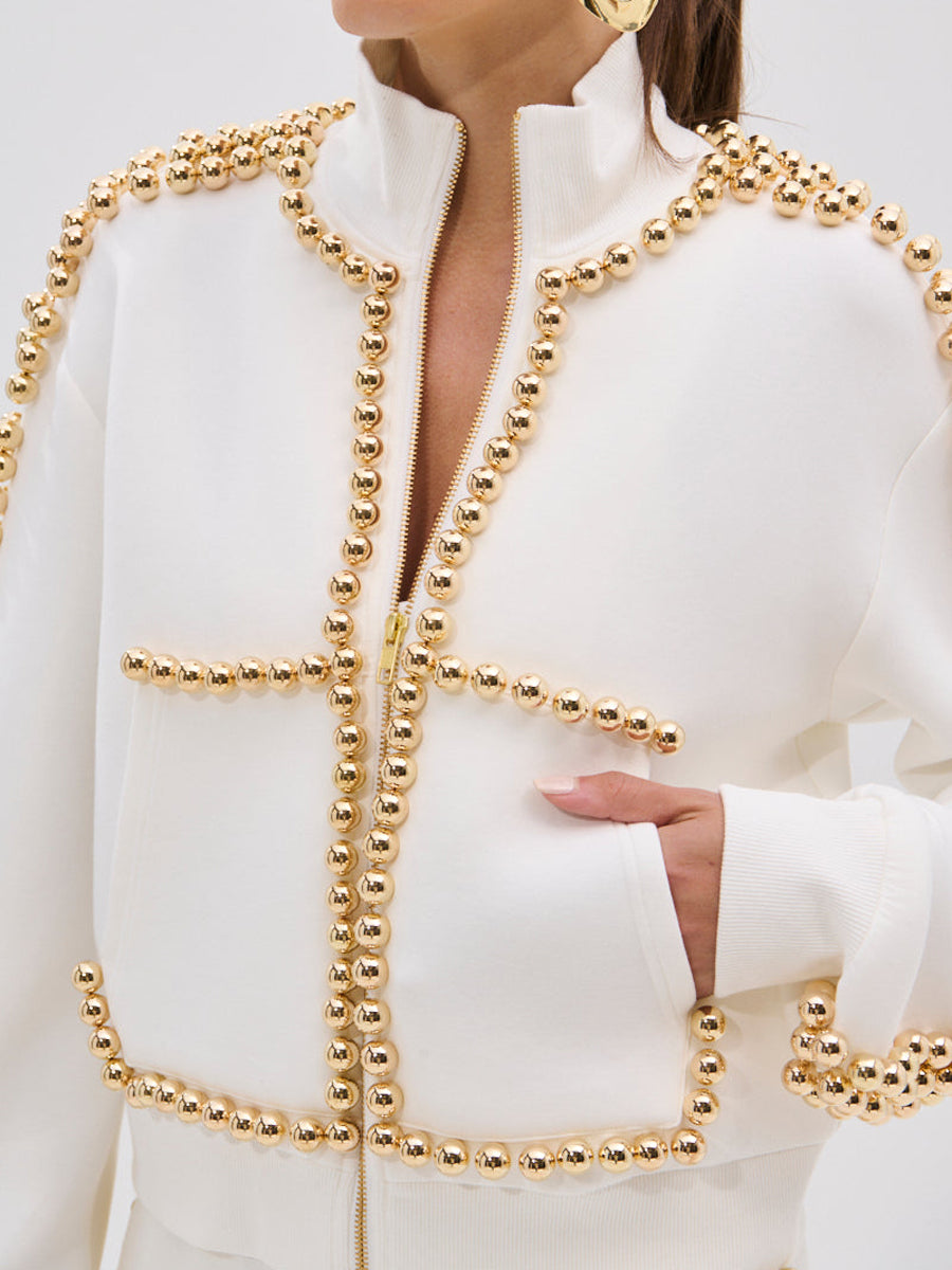 Crafted from a soft and stretchy, heavyweight knit blend, it features a mock neck, long sleeves with cinched cuffs, and metallic gold-tone ball embellishments that line the sleeves, shoulders, and hemlines. Complete with two front pockets and a metallic front zip closure. Style with the coordinating Label Balls To The Wall Jogger In White, leather slides, and metallic accessories to elevate your loungewear game.