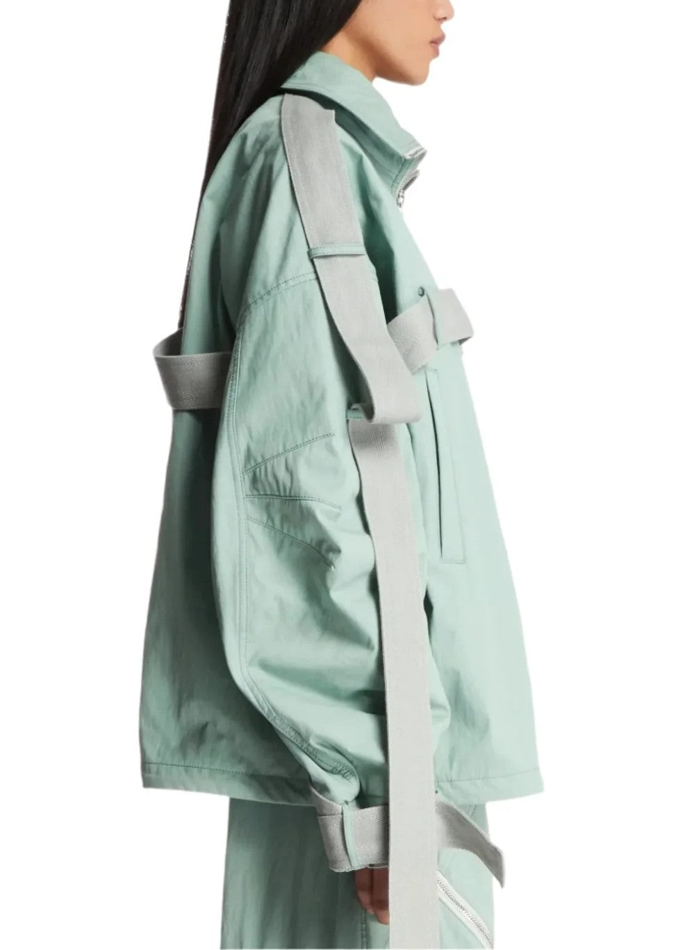 Outerwear with attitude. This is cut from a cotton-blend gabardine with technical texture and a distinctly oversized silhouette. Designed with dropped shoulders and tonal decorative belts wrapped around the body, it brings industrial edge to a classic utility shape.